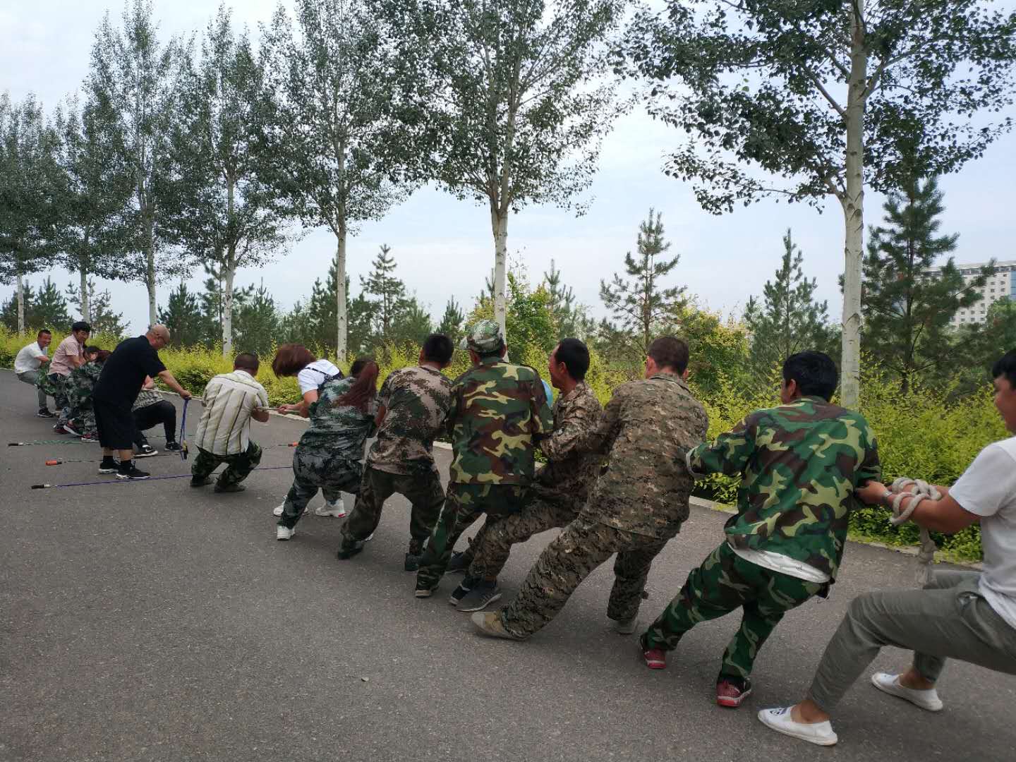 早上8點到黃河樓后,我們對18名新學員進行了分組,將隊員分成兩支隊伍,由隊長組織進行游戲。在隊長的帶領下,各隊隊員精誠合作,相互支持,先后進行了“跳繩比賽”、“個人跳繩比賽”、“斗牛比賽”“背對背運氣球比賽”“拔河比賽”、“俯臥撐比賽”等拓展項目。