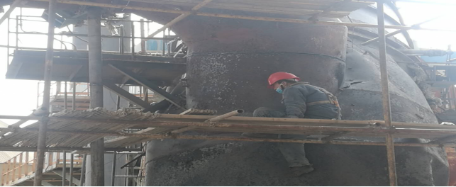 在回轉窯,做好更換窯磚前期準備工作——清理深挖4米處窯皮、窯磚。