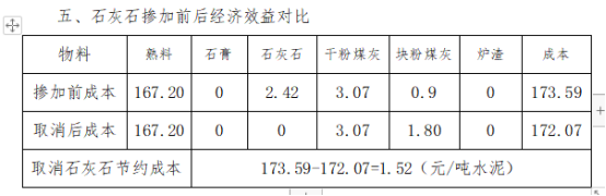 從上表看出,取消石灰石摻加后,噸水泥成本節約