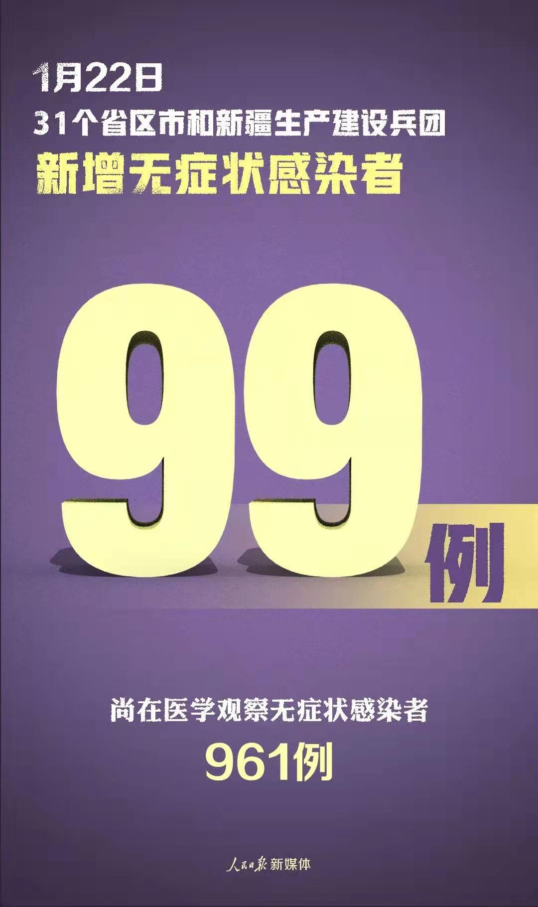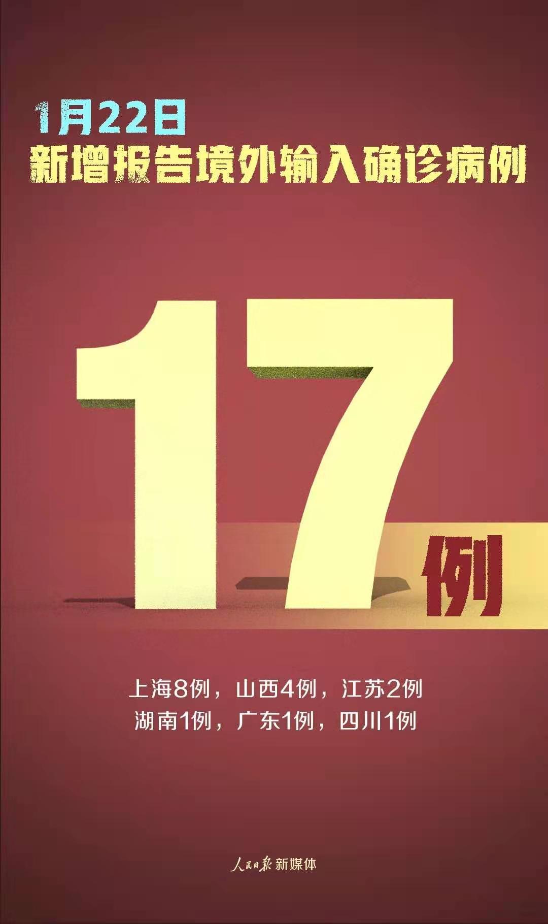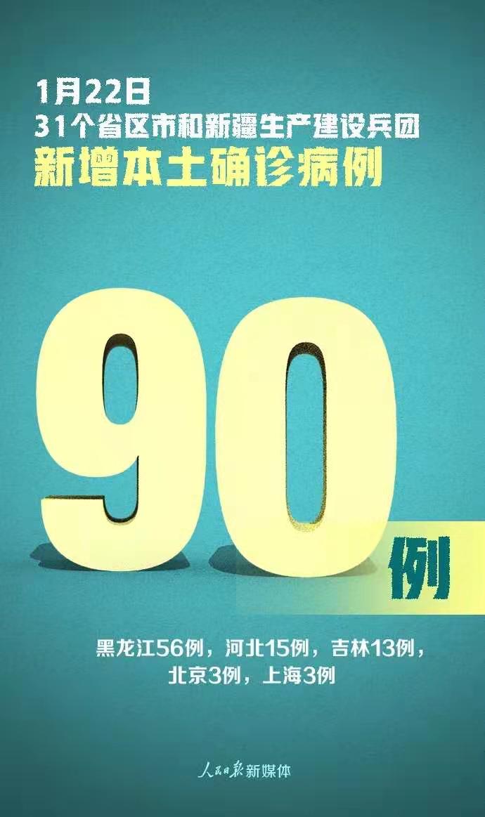 1月22日0—24時,31個省(自治區、直轄市)和新疆生產建設兵團報告新增確診病例107例,其中境外輸入病例17例(上海8例,山西4例,江蘇2例,湖南1例,廣東1例,四川1例),本土病例90例(黑龍江56例,河北15例,吉林13例,北京3例,上海3例);無新增死亡病例;新增疑似病例2例,其中境外輸入病例1例(在上海),本土病例1例(在上海)。