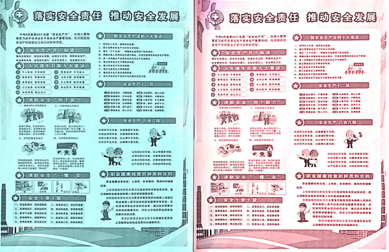 宣傳活動周。通過現場懸掛“安全生產月”相關內容的橫幅,張貼標語和宣傳畫,設置公共宣傳欄,組織員工觀看警示教育視頻,營造"安全生產月"活動氛圍。緊扣 “落實安全責任,推動安全發展”活動主題向大家發放了宣傳安全生產政策法規、防災減災宣傳單;現場講解安全科普常識、機械傷害知識及應急處置技巧,增強大家的安全生產意識,營造了濃烈的安全生產氛圍。此次安全生產月共計發放宣傳資料1100余份,懸掛宣傳橫幅2條,組織員工觀看警示教育視頻8場次,鼓勵員工參加漫畫制作、征文比賽等相關活動。通過此項活動,進一步強化廣大員工對“紅線意識”、“底線思維”、“安全發展理念”等安全生產重要論述的再學習和再領會。