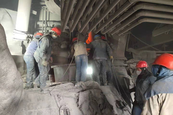 剛踏上平臺,首先映入筆者眼簾的,是一群穿著藍色牛仔工裝的工友們正在有序的拆卸二層爐面保溫材料準備更換燒損下料柱。只見他們個個干勁十足、衣服早已被汗水浸濕、黑乎乎的臉看不清誰是誰?他們顧不得爐面余溫的熾熱、爐面積灰的刺鼻積極投入到檢修中,一時間吶喊聲、叉車鳴笛聲,起重吊車的口哨聲,聲聲作響,猶如一首交響樂響徹整個檢修現場!在大家的齊心協力下,燒損下料柱順利被拆下,并按時裝好!