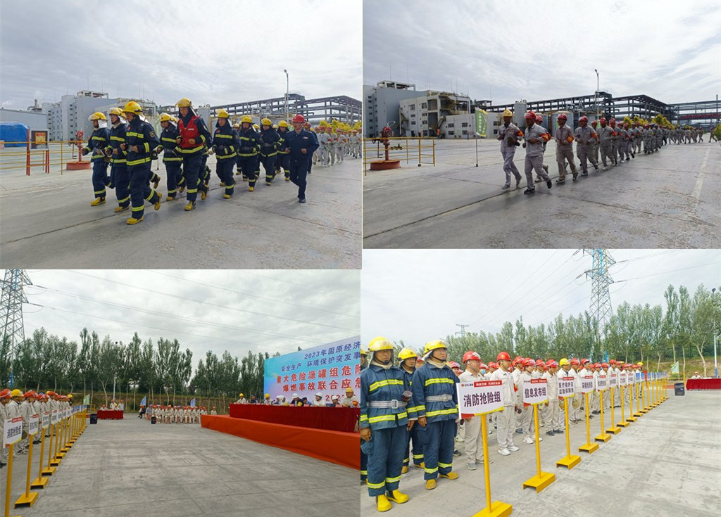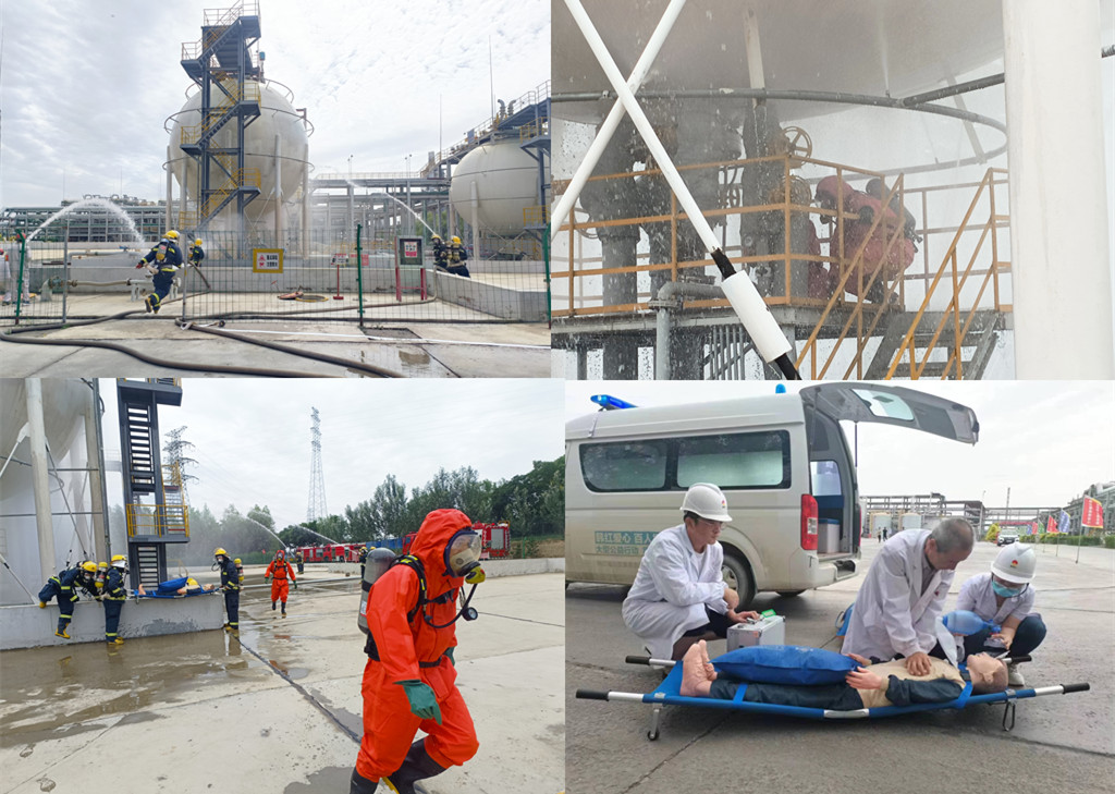本次演練主要內容是:2023年6月28日,金昱元廣拓能源有限公司2#罐區氯乙烯單體球罐發生泄露,在裝置處置過程中,搶修人員出現中毒癥狀,隨著泄露量的不斷增大,泄漏點突然起火,造成人員傷亡。在應急指揮部的科學決策、正確指揮下,經過廣拓能源公司及多方應急救援力量的協同配合下,這一起危險化學品泄露燃爆事故最終得到了成功處置。