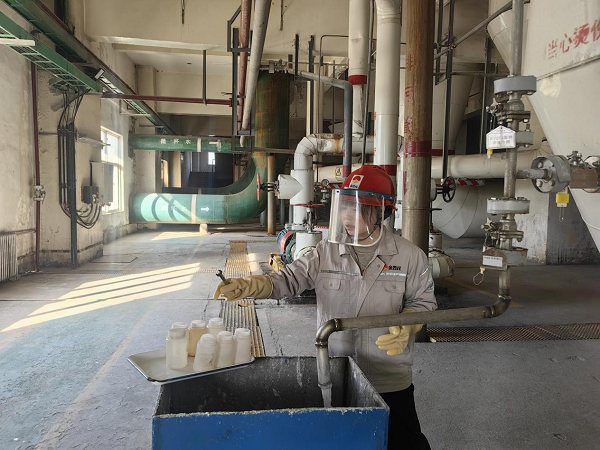 她們拎著貼好標簽的取樣瓶,快步走向鹽硝廠房的各個取樣點,回來時,取樣瓶里裝著各色各樣的樣品,有的是晶瑩剔透的液體,在瓶中輕輕晃動,泛起細碎的漣漪;有的是白色的晶體顆粒,隨著腳步的顛簸,發出“沙沙”的輕響;還有的是粘稠的漿液,掛在瓶壁上,緩緩滑落。將樣品放置在滴定檢測區的那一刻,瓶身與臺面碰撞,發出“叮”的一聲脆響,像是為接下來的化驗工作,敲響了開場的鼓點。