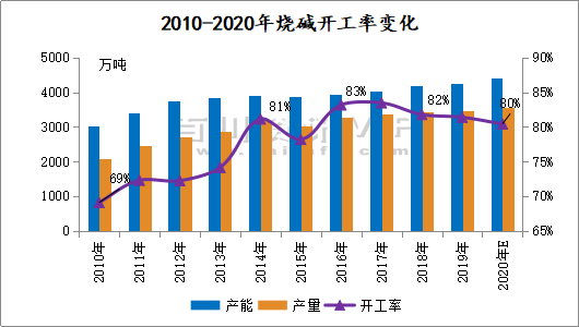 由此可見,2020年全國總產能實現穩步增長,但整體增速相比同期有所下降,受全球公共衛生事件沖擊,燒堿下游需求表現不佳,整體行情不甚樂觀。出于整體需求和供需平衡考量,預計未來產能增速將有放緩表現,具體發展變化還需關注后續全球公共衛生事件處置情況及市場行情實時變化。