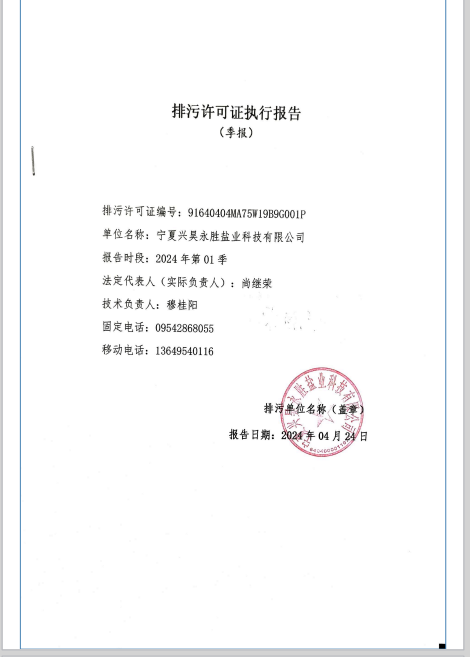 寧夏興昊永勝鹽業科技有限公司2024年第1季度排污許可執行報告